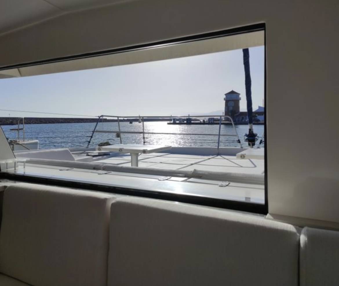 Our catamaran impresses with its large amount of space and high stability when sailing. Between the two hulls, the saloon offers a large area with plenty of comfort and living space with the best all-round visibility and lots of light.