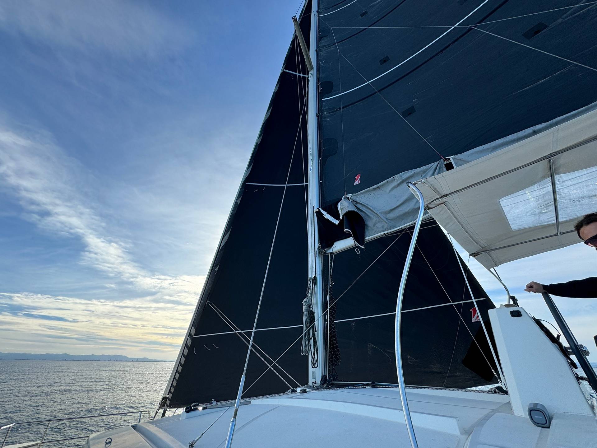 The catamaran has a mainsail, a jib and also a huge Code 65 genoa sail made of carbon laminate.